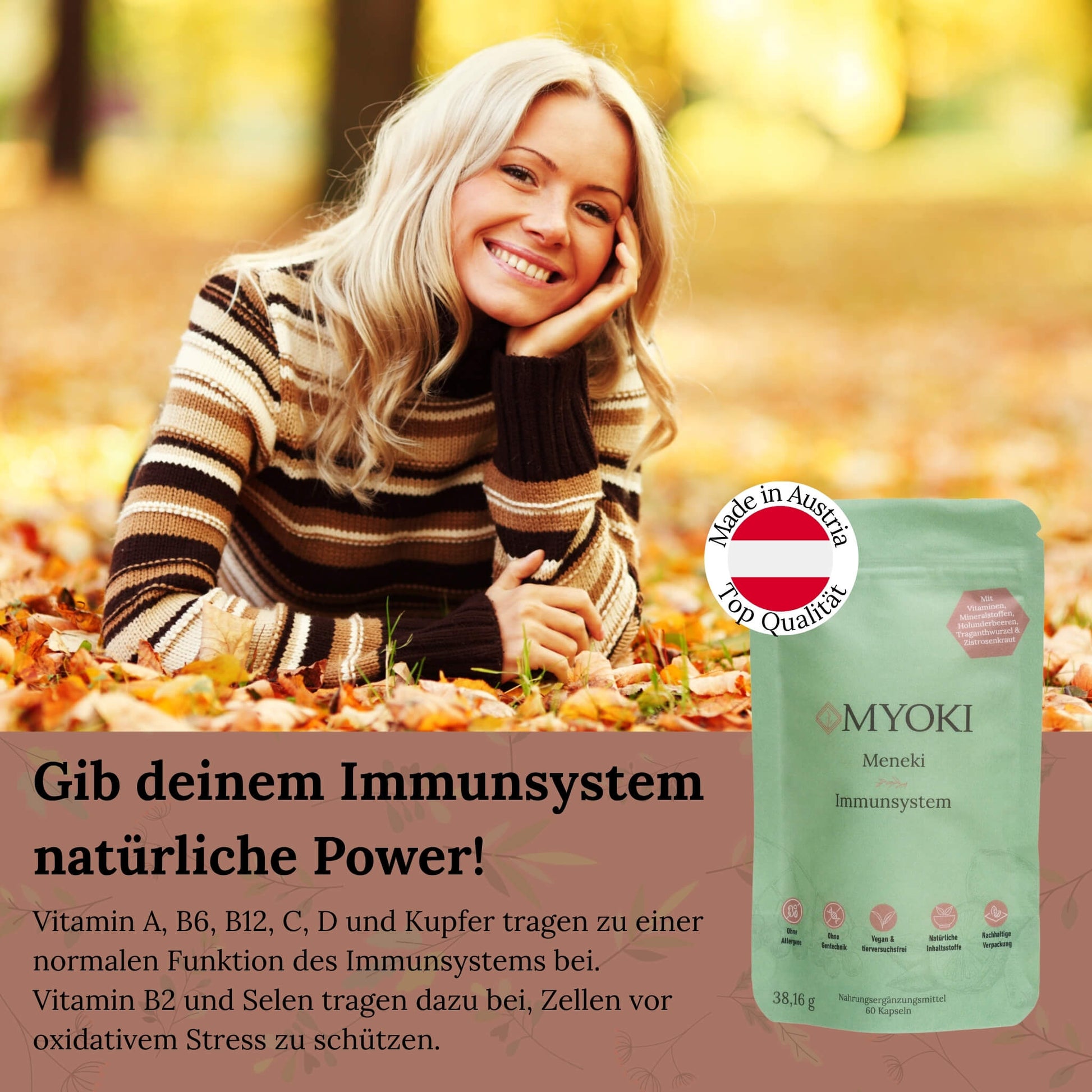 Stärke deine Abwehrkräfte mit unseren Meneki Kapseln, die angereichert sind mit einer Mischung aus Vitaminen, Mineralstoffen und kraftvollen Pflanzenextrakten. Diese sorgfältig abgestimmte Kombination unterstützt dein vitales Immunsystem und hilft deine natürlichen Abwehrkräfte zu stärken. Mit nur zwei Kapseln am Tag förderst du dein Wohlbefinden und bereitest dich darauf vor, jeden Tag mit Energie und Zuversicht zu meistern.